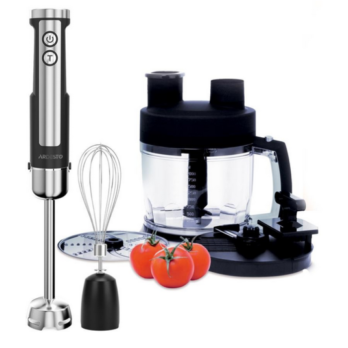 Погружной блендер ARDESTO HBG-1000WHCHSL черно-серебристого цвета пригодится для быстрого приготовления коктейлей, смузи, соков и различных соусов. Оснащен двигателем мощностью 1 000 Вт с низким уровнем шума, двумя режимами работы (обычный и турбо) и пятью скоростями. К тому же, доступны семь функций приготовления продуктов: смешивание, измельчение, взбивание, шинкование, трение, нарезание кубиками и картофель фри. Устройство имеет тонкую эргономичную рукоятку со специальным противоскользящим покрытием и подсветкой кнопок управления. Лезвие изготовлено из нержавеющей стали, на ножке предусмотрена защита от разбрызгивания. В комплекте: мерная чаша объемом 600 мл, чаша объемом 2 000 мл, насадка для взбивания, насадка для нарезки кубиками, насадка для нарезки в форме картофеля фри. Длина кабеля питания составляет 1,3 м.