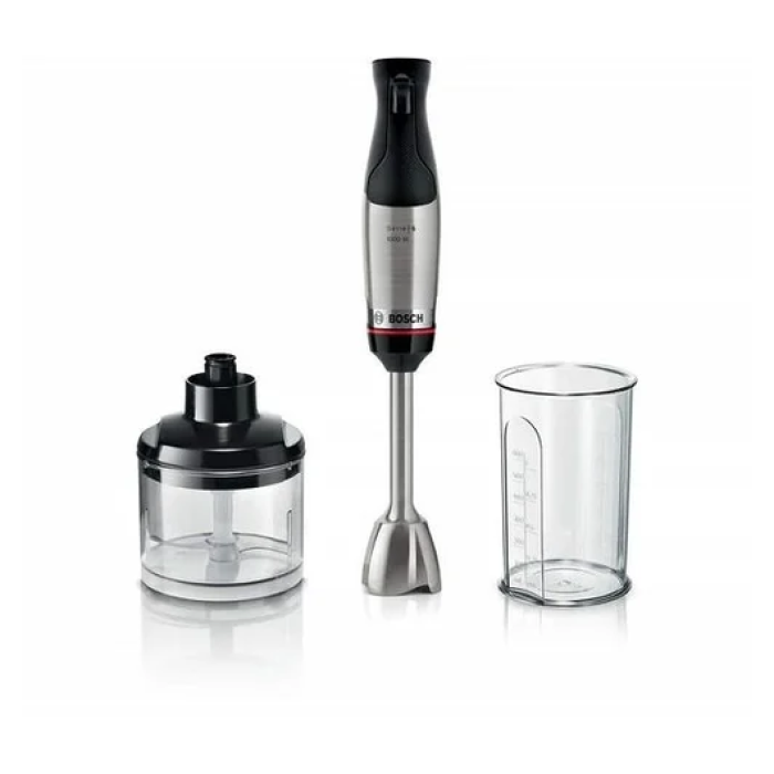 Миксер Bosch оснащен высококачественной ножкой для смешивания с системой QuattroBlade System Pro и практичным измельчителем объемом 500 мл, который измельчает травы, орехи, сыр, мясо и многое другое, и прозрачным мерным стаканом.