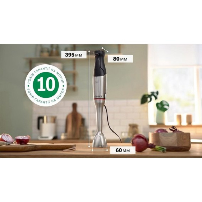 Погружной блендер, мощность 1200 Вт, плавная бесступенчатая регулировка скорости, керамическое соединение ножки блендера с корпусом, погружная часть из нержавеющей стали, четыре лезвия QuattroBlade Pro, функция AntiSplash – защита от брызг. Система Quattro-Blade Pro с ускорителями потока AntiSplash