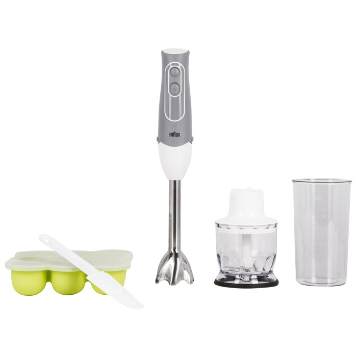 Погружной блендер серии MultiQuick 5. Максимальная мощность моторного блока: 600 Вт. Количество скоростей: 2. Цвет: белый/серый.