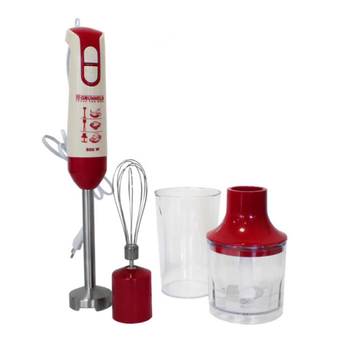 Погружной блендер Grunhelm EBS-800SR – мощный, надежный бытовой прибор который станет незаменимым помощником на любой кухне. Предназначен для измельчения, взбивания, дробления, смешивания овощей и фруктов, приготовления коктейлей и т. д. Блендер оборудован электромотором мощностью 800Вт, что позволяет легко справлятся с поставленными задачами. Ножка блендера и блок двигателя изготовлены из ударопрочного пластика, а режущий элемент из высококачественной нержавеющей стали. Среди особых отличий стоит отметить наличие чаши измельчителя с нержавеющими ножами и две турбо скорости работы, что значительно расширяет функционал данной модели. Все выше перечисленные качества делают покупку данного блендера разумным и экономичным решением.