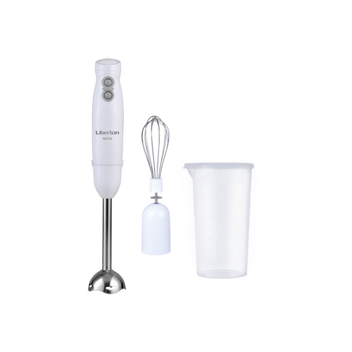 Мощность: 600 Вт; Тип: погружной; Количество скоростей: 2; Плавное регулирование: нет; Турборежим: да; Комплектация: 3 в 1; Аксессуары: насадка "блендер", венчик для взбивания, мерный стакан (600 мл); Нож: нержавеющая сталь; Материал корпуса: пластик; Цвет: белый.