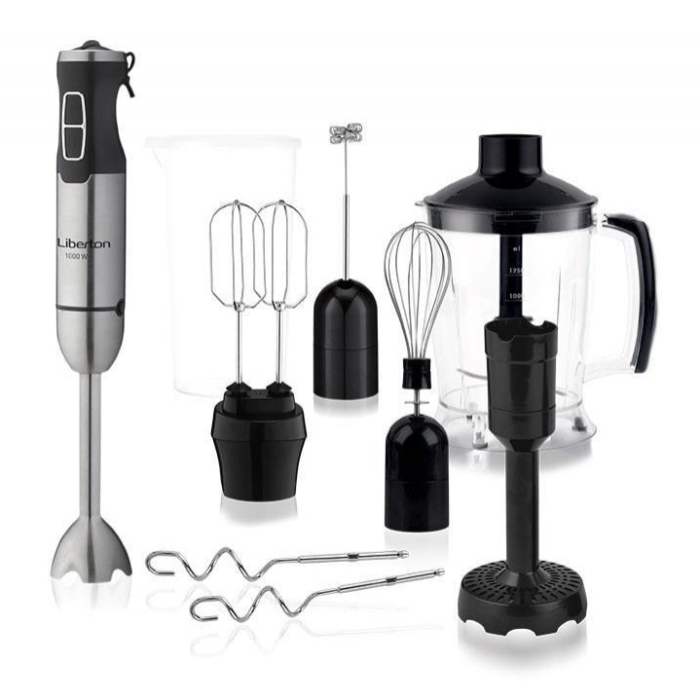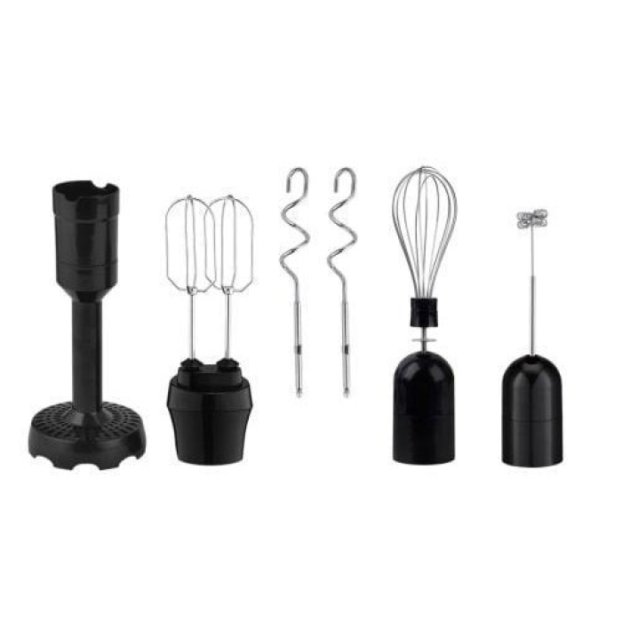 Мощность: 1000 Вт; Тип: погружной; Количество скоростей: 2; Плавное регулирование: да; Турборежим: да; Комплектация: 8 в 1; Аксессуары: насадка "блендер", венчик для взбивания, мерный стакан (600 мл), насадка-миксер, гак для теста, насадка для пюре, вспениватель для молока, чаша измельчителя (1250 мл); Нож: нержавеющая сталь; Материал корпуса: пластик; Цвет: черный+нерж.
