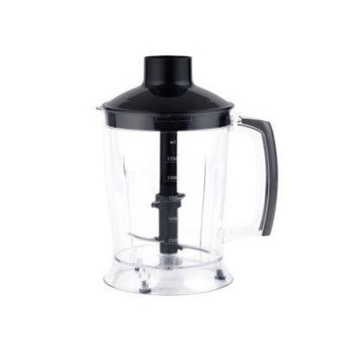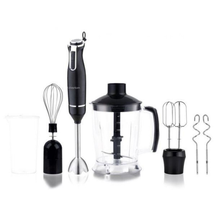 Потужність: 800 Вт; Тип: занурювальний; Кількість швидкостей: 2; Плавне регулювання: так; Турборежим: так; Комплектація: 5 в 1; Аксесуари: насадка "блендер", вінчик для збивання, мірний стакан (600 мл), чаша подрібнювача (1250 мл), насадка-міксер, гак для тіста; Ніж: нержавіюча сталь; Матеріал корпусу: пластик; Колір: чорний.