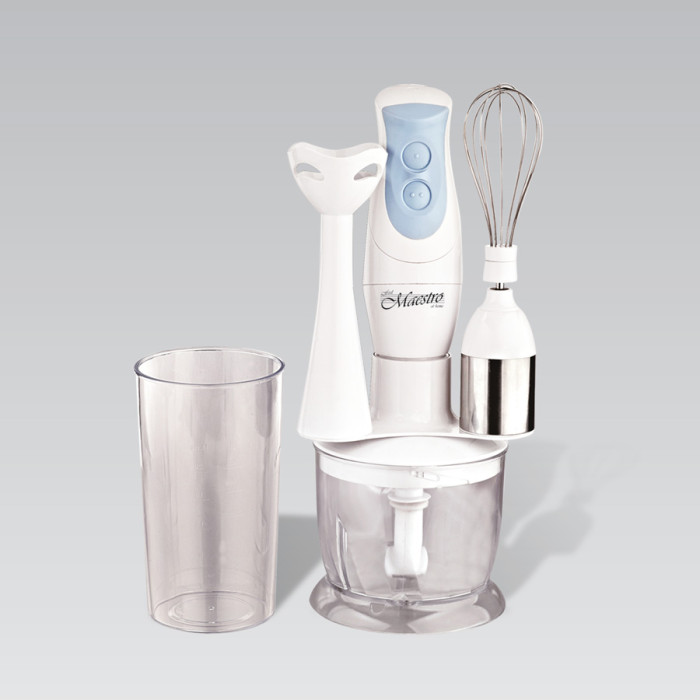 Многофункциональный блендер Maestro MR 563 мощностью 300 Вт работает в двух скоростных режимах, поставляется в комплекте с венчиком для взбивания белка, чашей для измельчения и мерным стаканчиком объёмом 600 мл, имеет белый пластиковый корпус и ножи из нержавеющей стали. Блендер предназначен для измельчения пищи, приготовления эмульсий, пюре, взбивания напитков, муссов и т. п., а также для колки льда.