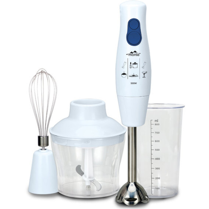 Погружной блендер Monte MT-1902 работает от питания от электросети стандарта 220В. Во время использования прибор необходимо держать рукой, а, учитывая, что габариты небольшие и мощность 500 Вт, все компоненты смешиваются и пюрируются за считанные минуты, и весь процесс превращается в увлекательное мероприятие.