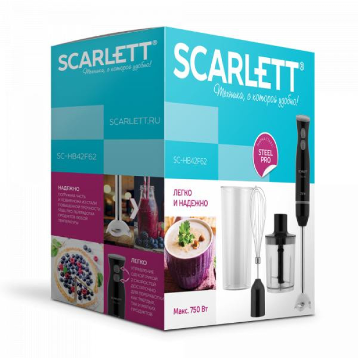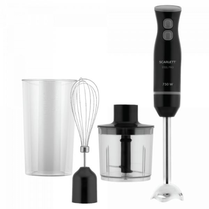Занурювальний блендер Scarlett SC-HB42F62 оснащений потужним мотором 750 Вт, до нього додається міні-подрібнювач, мірна склянка та віночок, за допомогою яких можна подрібнювати продукти, готувати тісто, збивати крем, виконувати інші завдання.  Занурювальна частина блендера виготовлена ​​з міцної нержавіючої сталі власної марки Steel Pro, а завдяки ергономічній формі корпусу прилад особливо добре лежатиме в долоні.  Щоб отримати ідеальний результат, використовуйте режим Turbo на завершальних етапах подрібнення або збивання.