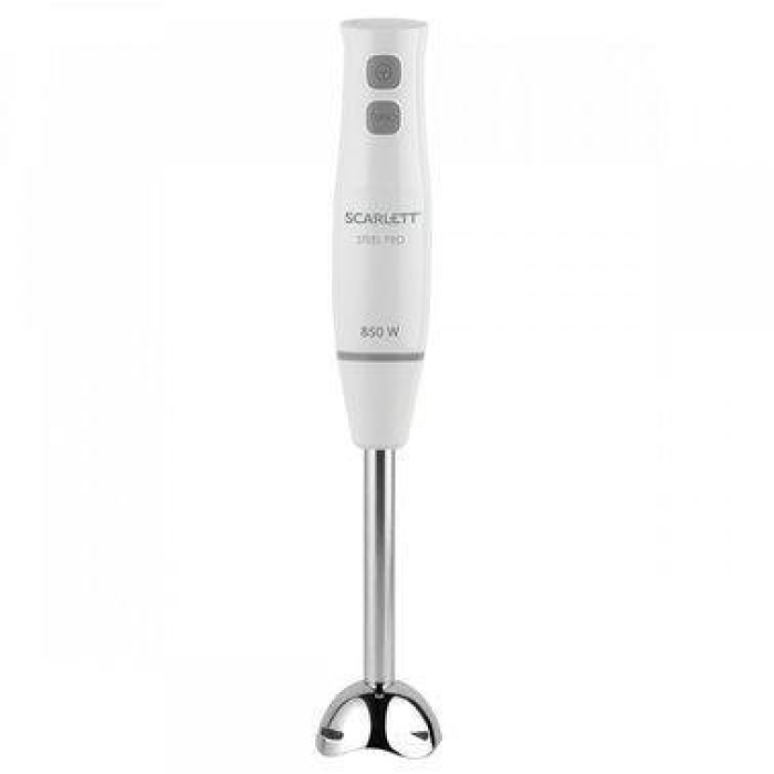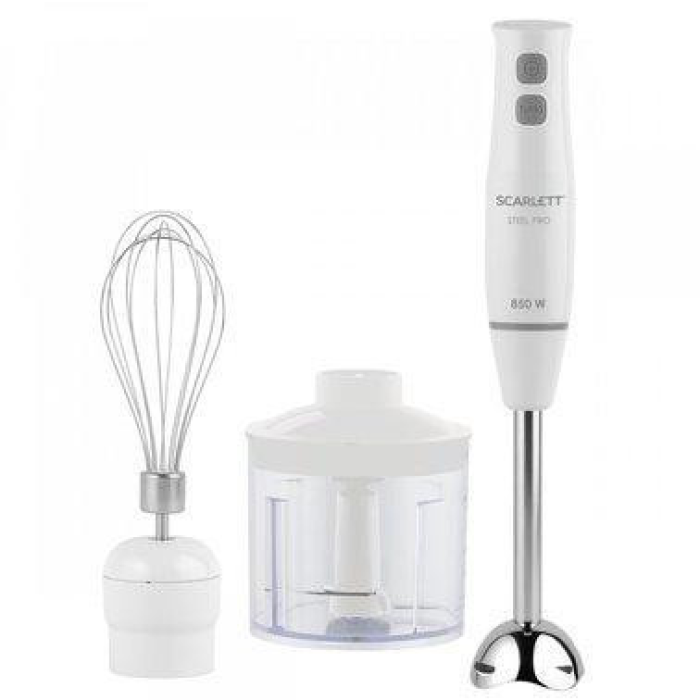 Погружной блендер Scarlett SC-HB42F84 изготовлен в современном дизайне в белом цвете. В его эргономичной ручке размещён электродвигатель мощностью 850 Вт, работающий в двух режимах: основном и турбо. Модель укомплектована тремя насадками, предназначенными для разных видов обработки продуктов. Первая – это ножка из нержавеющей стали, нижняя часть которой выполнена в форме полусферы с прорезями, а внутри её находится двухлезвийный нож. Такая конструкция предотвращает разбрызгивание, сохраняя рабочую кухонную поверхность в чистоте. Вторая – измельчитель в виде двухлопастного ножа с полукруглыми лезвиями, находящийся в цилиндрической прозрачной чаше из пластика объёмом 0,5 литра. Третья насадка – это венчик для взбивания. Управляется погружной блендер Scarlett SC-HB42F84 двумя удобно расположенными на ручке кнопками.