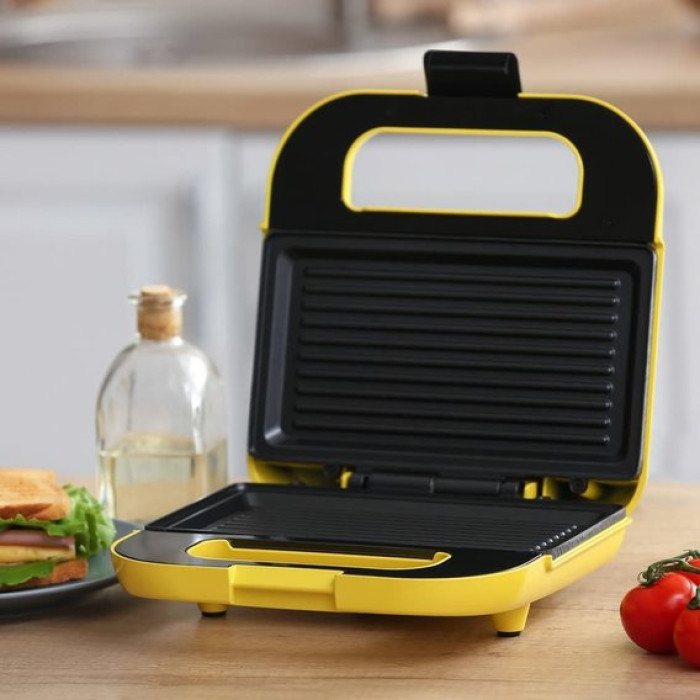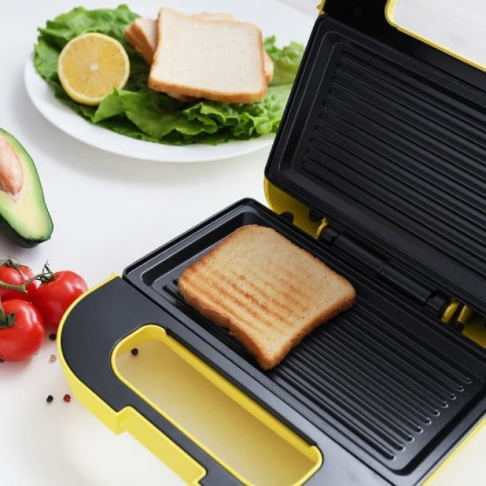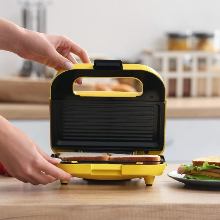 Бутербродниця MG-374 має всі необхідні функції для того, щоб швидко приготувати смачні та поживні сендвічі. Одночасно в ній можна випікати відразу по 4 сендвічі, краї яких щільно спаюють борти форм, надійно замикаючи начинку всередині. Корпус виготовлений із висококласного термостійкого пластику жовтого кольору. Тип листа - підсмажений сендвіч. Нагрівальний елемент потужністю 750 Вт забезпечить швидке і рівномірне нагрівання двох робочих поверхонь з керамічним покриттям. Бутербродниці Magio дуже зручні у користуванні, сендвічі не пригорають і легко витягуються. Завдяки компактним розмірам та фіксатору бутербродницю зручно зберігати. На кришці є світлові індикатори живлення та готовності до роботи, що полегшує контроль процесу приготування.