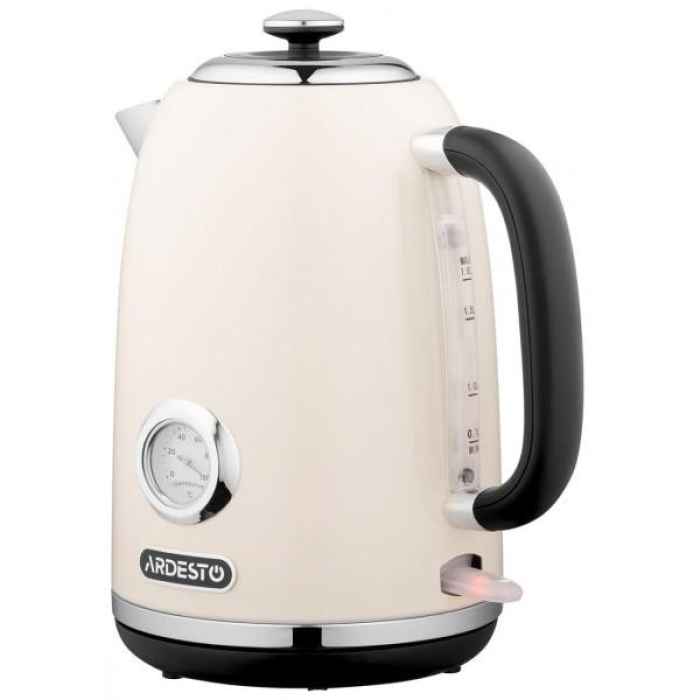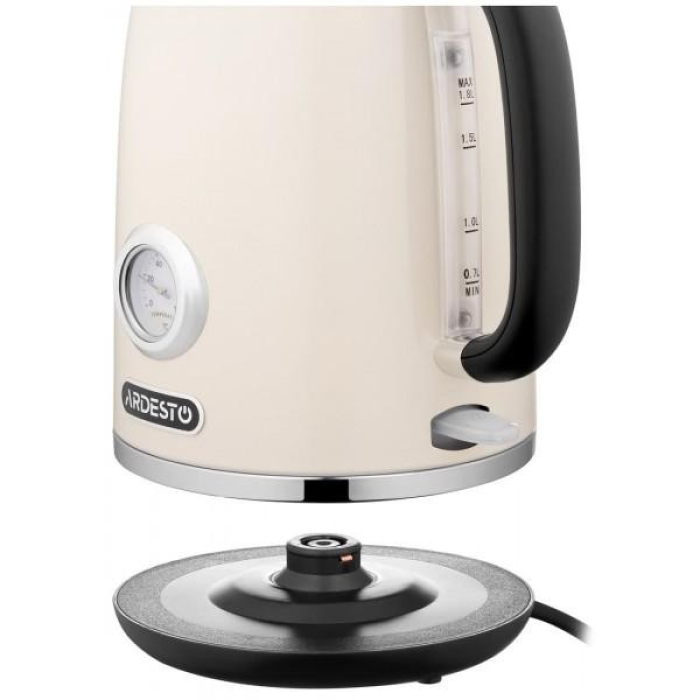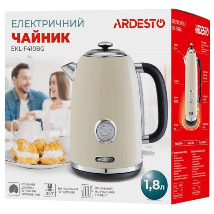 Чайник Ardesto EKL-F410BG відрізняється простим елегантним дизайном. Він кип'ятить до 1,8 літра води, завдяки індикатору кількості ви можете набрати рівно стільки води, скільки вам потрібно. Носик має таку форму, щоб заливка була точною і без непотрібного розбризкування води. Ви можете поставити чайник на підставку з поворотом на 360° з будь-якої зручної для вас сторони. Завдяки прихованому нагрівальному елементу чайник можна легко та безпечно чистити. Вбудований механічний термометр з градуванням дозволить підігріти воду до потрібної температури та правильно приготувати чай. Він має потрійну систему захисту. Захищає від перегріву, сухого кип'ятіння та автоматично відключається після закипання води.