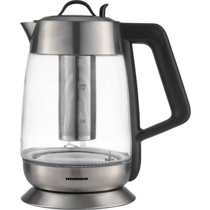 Электрочайник, мощность 2200 Вт, объем 1,8 л, скрытый нагревательный элемент, 5 темературных режимов, фильтр, сенсорное управление, автотключение при закипании, вращение корпуса на 360º, корпус из стекла