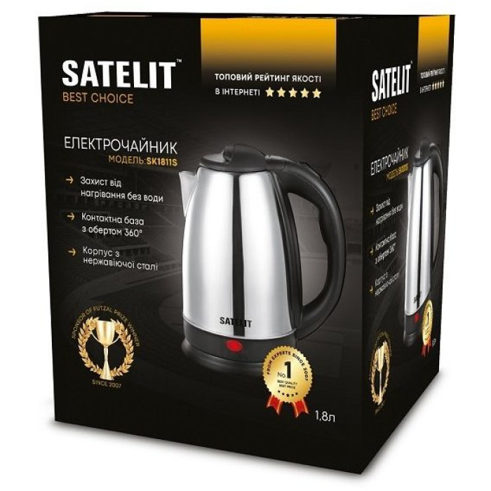 Satelit SK1811S - електричний чайник в універсальному дизайні, який має чудовий вигляд у будь-якому кухонному інтер'єрі. Сталевий корпус надійно захищає всі деталі чайника від пошкоджень. Він не потребує особливого догляду і має відмінні експлуатаційні якості. Потужність 1500 Вт, якої цілком достатньо для ефективного нагріву води, при цьому апарат відрізняється високою економічністю. Він вміщує в собі 1.8 л. води, завдяки чому відмінно підходить як маленькій, так і великій родині. Оснащений функцією автоматичного вимкнення під час закипання води, що не може не тішити, а функція автовимкнення за відсутності води вбереже його від поломок і значно збільшить експлуатаційний термін.