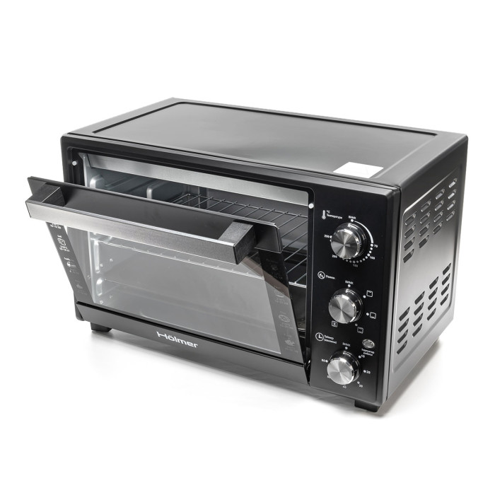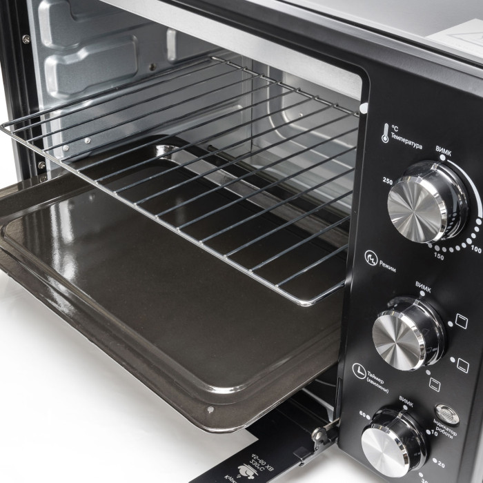 Духовка електрична, потужність 1700 Вт, об'єм 42 л, механічне управління, гриль, випікання, запікання, таймер 60 хв, терморегулятор 70-250ºС, звуковий сигнал, індикатор роботи, термостійке скло, внутрішня поверхня камери - антипригарна, корпус з нержавіючої