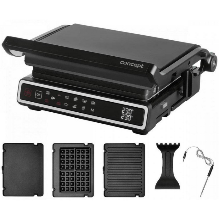 Контактный гриль с датчиком температуры Concept GE3550 имеет антипригарные пластины, которые позволяют готовить на гриле без масла и легко моются. Он оснащен интеллектуальными функциями Split zone, Grill Assistant, пластинами для приготовления вафель, цифровым управлением и 11 автоматическими приложениями, включая ручной режим DIY.