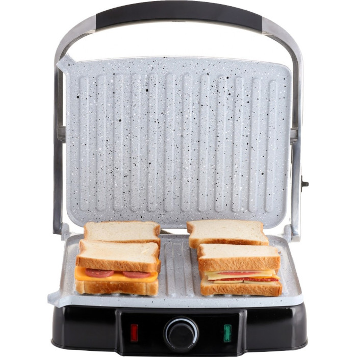 Конструкція гриля з двома ребристими поверхнями з антипригарним покриттям дозволяє приготувати корисні страви з мінімальною кількістю жиру. Управління представлене механічним поворотним регулятором, що задає потрібну потужність. Про включення та стан приладу сповіщають світлові індикатори.
