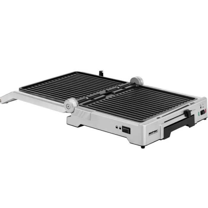 Електрогриль притискний MPM Product MGR-10M з можливістю розкриття на 180 градусів дозволить насолоджуватися приготованими на ньому ароматними та смачними овочами, м'ясом та рибою. У процесі готування продукти стикаються з рифленою поверхнею, рівномірно просмажуються та виходять соковитими без застосування жиру. Така технологія приготування позитивно сприйметься прихильниками корисного харчування та здорового способу життя. Потужність приладу становить 2000 Вт і забезпечить швидке та рівномірне нагрівання. Рифлена робоча поверхня гриля виконана з антипригарним покриттям і після приготування легко і просто очищається. Весь зайвий жир і сік, що утворюються в процесі обсмажування продуктів на притискному електрогрилі MPM Product MGR-10M, стікають у спеціальний висувний піддон, тому страви не підгоряють і готуються без диму.
