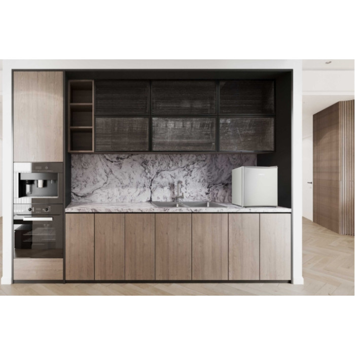 Модель DFM-50X с общим объемом 43 литра имеет небольшую встроенную морозильную камеру на 7 литров. Внутреннее пространство холодильника разделено на два отсека, а на дверце предусмотрено две полки для различных баночек и напитков. Высота холодильника — всего 49 см, а вес составляет 13.7 кг, поэтому Ardesto DFM-50X идеально впишется в небольшом помещении, например, в номере отеля, кафе или летней кухне. Пространства внутри хватит для самых необходимых продуктов и напитков.
