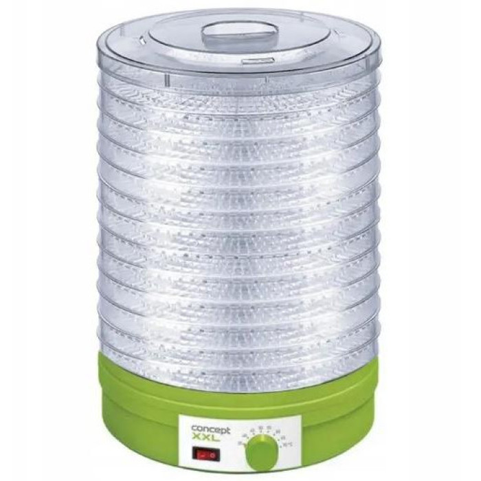 Електрична сушарка фруктів торгової марки Concept позиціонується в якості відносно недорого рішення з місткістю XXL. Так, модель комплектується 12 піддонами діаметром 32 см кожен, що дозволяє за один раз заготовити досить великий запас сушених продуктів. Це можуть бути яблука і груші, сезонні ягоди, цитрусові, лікувальні трави, гриби, овочі або навіть м'ясо з рибою. Лотки виконані з прозорого пластика, що дозволяє візуально контролювати процедуру висушування. А вже після завершення робочого циклу для очищення від забруднень піддони можна розмістити в посудомийці. Сушарка фруктів Concept SO - 1025 передбачає нижнє розташування нагрівального елементу на 245 Вт, що покликане забезпечити рівномірний розподіл тепла.