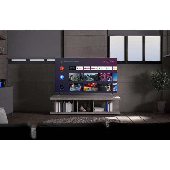 Підійде на роль ключового елемента домашнього кінотеатру або побутового центру мультимедійних розваг. Якісний екран на базі 8-бітної матриці типу HVA (різновид класичної технології Vertical Alignment) має надвисоку роздільну здатність 3840х2160 і значну щільність пікселів 80 ppi (31 пікс/см) для рівної картинки без пікселізації. Завдяки високій яскравості (до 500 кд/м2) і підвищеній контрастності 7000:1 гарантується точне відображення високодеталізованих HDR-відео. Передбачено прийом аналогового, цифрового ефірного (DVB-T2) і кабельного (DVB-C) мовлення. SMART-оболонка Android TV 9 підтримує установку додатків з Google Play і дозволяє легко підключити телевізор до глобальної мережі.