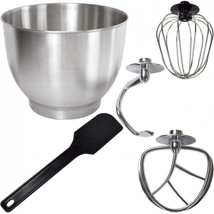 Для работы в вашем расположении три насадки: венчик для взбивания, крюк для замеса тугого теста и лопатка для приготовления мягкого теста и взбивания кремов. Кухонная машина работает в восьми режимах (семь режимов скорости плюс режим пульсации).