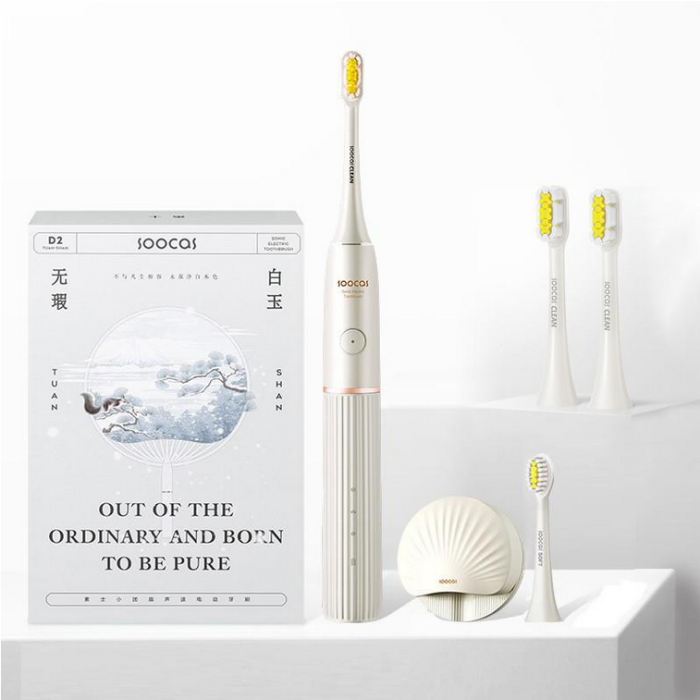 Soocas D2 обладает пластиковым корпусом с влагозащитой IPX7. Щетка предлагается в оливково-зеленом и молочно-белом цвете. В верхней части корпуса располагается логотип «Soocas», а под ним – единственная кнопка управления. Посередине имеется позолоченная вставка, а после нее корпус гаджета приобретает рельефную фактуру. В этой зоне электрощетки вертикально в ряд установлено 4 светодиодных индикатора. Вес девайса составляет всего 485 г.