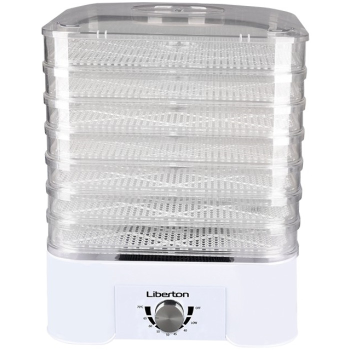 електросушарка бренду Liberton належить до рішень на стику початкового і середнього цінового сегмента. 520-ватний нагрівач і вентилятор моделі знаходяться біля основи корпусу, тут же розташовується і єдиний орган управління-поворотний перемикач. Він служить як для включення / вимикання, так і для вибору необхідної температури нагріву. Є режим LOW (близько 35 °C) і ще 7 рівнів з кроком в 5 градусів Цельсія від 40 до 70 °C. над підставою сушарки фруктів Liberton LFD 5522 розташовуються 7 лотків, виконаних з харчового пластику.