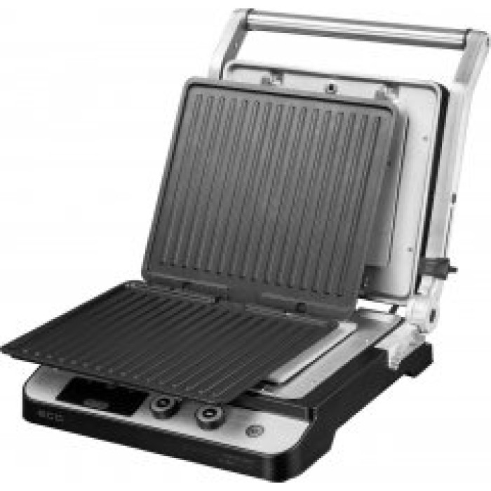 Электроприжимной гриль ECG KG 1000 Gourmet выполнен в современном стильном дизайне. Он работает в 4 рабочих положениях: гриль, контактное и бесконтактное приготовление и открытый барбекю-гриль. Такие возможности снабжаются конструкцией модели. Ее крышка устанавливается на 6 уровнях от нижней панели, а также способна открываться на 180 градусов.