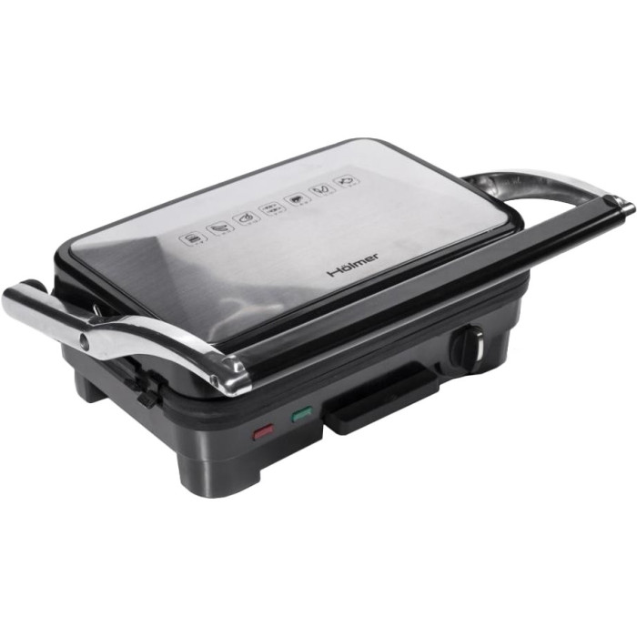 Прижимной электрогриль Holmer HCG-18P представляет собой компактное устройство, выполненное в современном дизайне. Он сделан в настольном варианте и имеет мощность 1800 Вт. Модель укомплектована двумя съемными пластинами размером 29х18,8 см. Они двухсторонние и покрыты антипригарным материалом, причем одна рифленая сторона, а другая гладкая.