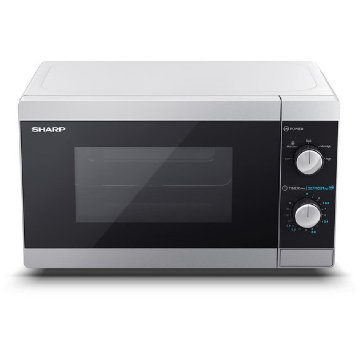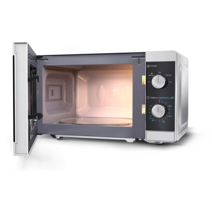 Універсальна мікрохвильова піч місткістю 20 л. Естетична, проста у використанні та готова до використання на будь-якій кухні. Завдяки 5 хвильовим рівням та функції відтавання, він дозволяє готувати смачні страви або розігрівати готові продукти. Тарілка, що обертається, гарантує рівномірне нагрівання, а таймер захищає страву від опіків.