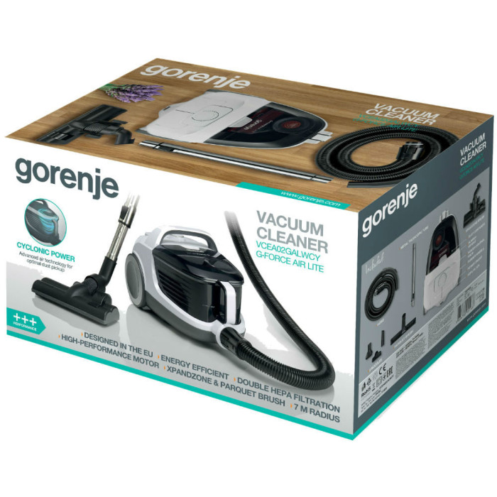 Велика щітка XpandZone Х-подібний отвір великої універсальної щітки XpandZone збільшує площу всмоктування пилу з килимів, твердих поверхонь і паркету. Це підвищує ефективність прибирання та економить час. Прогумовані коліщатка Прогумовані коліщатка запобігають ушкодженню делікатних підлогових покриттів, наприклад, паркету і забезпечують постійний контакт з поверхнею. Пилосос не залишає слідів і подряпин на гладких і твердих поверхнях. Комплект додаткових насадок До пилососа додається комплект з трьох додаткових насадок, які значно спростять прибирання в будинку. Автозмотування шнура Автоматичне змотування шнура дозволяє швидко прибрати шнур всередину пилососа після завершення прибирання. Є штатним обладнанням всіх пилососів Gorenje.