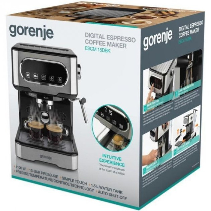 Рожкова кавоварка еспресо Gorenje ESCM15DBK виготовляється в сучасному дизайні в настільному виконанні. Її компактний і елегантний корпус у кольорі нержавіючої сталі та чорному відрізняється згладженими переходами між гранями, що надає конструкції стильності та шарму.