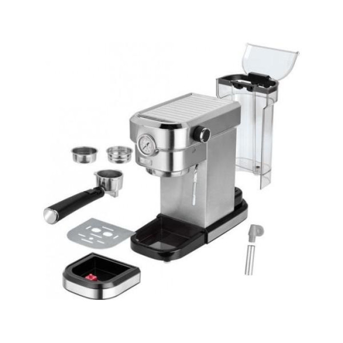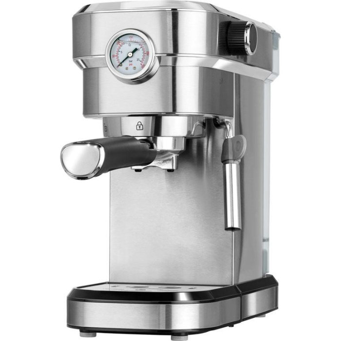 Ріжкова кавоварка еспресо MPM Product MKW-08M виготовлена в корпусі з нержавіючої сталі в футуристичному дизайні з хромованими ручками і елементом в стилі ретро - круглим стрілочним манометром. Вона призначена для приготування кавових напоїв з меленої кави і обладнана знімним резервуаром для води ємністю 1,2 літра. Модель потужністю 1350 Вт створює тиск 20 бар, а її вбудована система Thermoblock виконує нагрівання за 70 секунд.