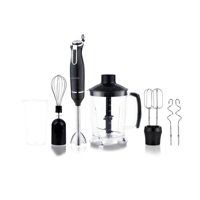 Мощность: 800 Вт; Тип: погружной; Количество скоростей: 2; Плавное регулирование: да; Турборежим: да; Комплектация: 6 в 1; Аксессуары: насадка "блендер", венчик для взбивания, мерный стакан (600 мл), чаша измельчителя (1250 мл), насадка-миксер, гак для теста; Нож: нержавеющая сталь; Материал корпуса: пластик; Цвет: черный.