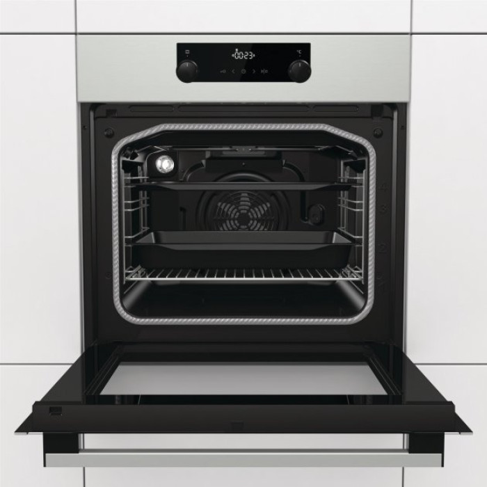 Электрический духовой шкаф бренда Gorenje предлагает хорошее соотношение цены и качества, а еще – стильный дизайн в духе минимализма. Это вместительная модель на 70 л, позволяющая готовить в больших объемах. Причем объединение технологии MultiFlow 360° и сводчатой формы HomeMade обеспечивает хорошую циркуляцию горячего воздуха и позволяет готовить на нескольких уровнях одновременно без смешивания вкусов и запахов. Не забыли при этом и безопасность: система DC+ эффективно охлаждает корпус прибора, чтобы исключить риск ожогов во время использования. Помогают в этом и четыре стекла дверцы с двумя термослоями.