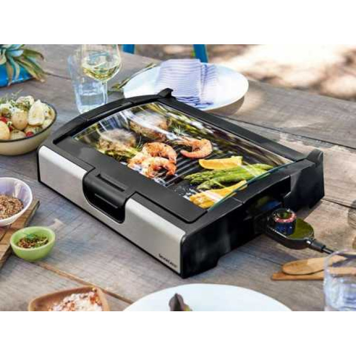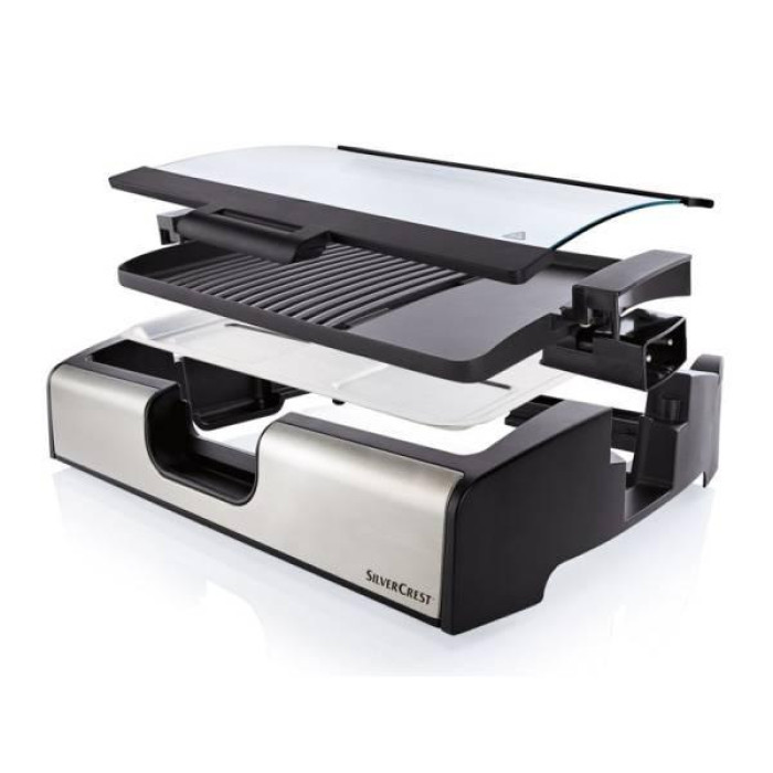 Прижимной электрогриль SilverCrest SKG 1700 B3 выполнен в стильной, представительской и основательной настольной конструкции. Она отличается продуманными деталями, позволяющими готовить блюда комфортно и продуктивно. Устройство мощностью 1700 Вт оснащено двумя съемными пластинами размером 33х12 см с желобком для стекания жира и паром поддонов для его сборки.