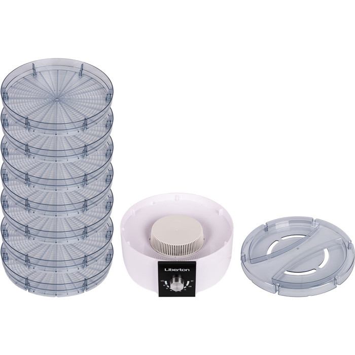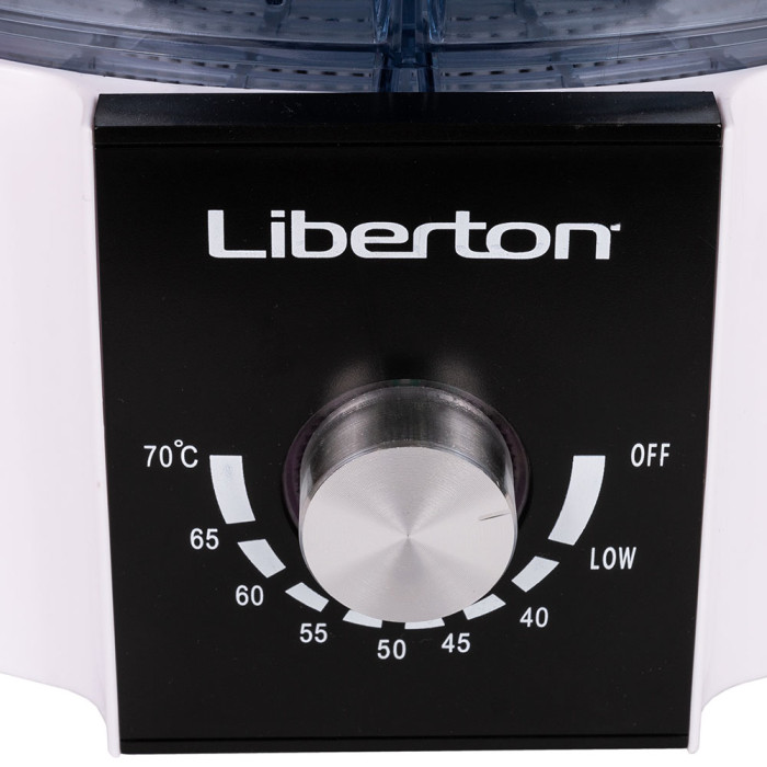 520-ватний нагрівач і вентилятор моделі знаходяться біля основи корпусу, тут же розташовується і єдиний орган управління-поворотний перемикач. Він служить як для включення / вимикання, так і для вибору необхідної температури нагріву. Є режим LOW (близько 35 °C) і ще 7 рівнів з кроком в 5 градусів Цельсія від 40 до 70 °C. над підставою сушарки фруктів Liberton LFD 5523 розташовуються 7 лотків, виконаних з харчового пластику.