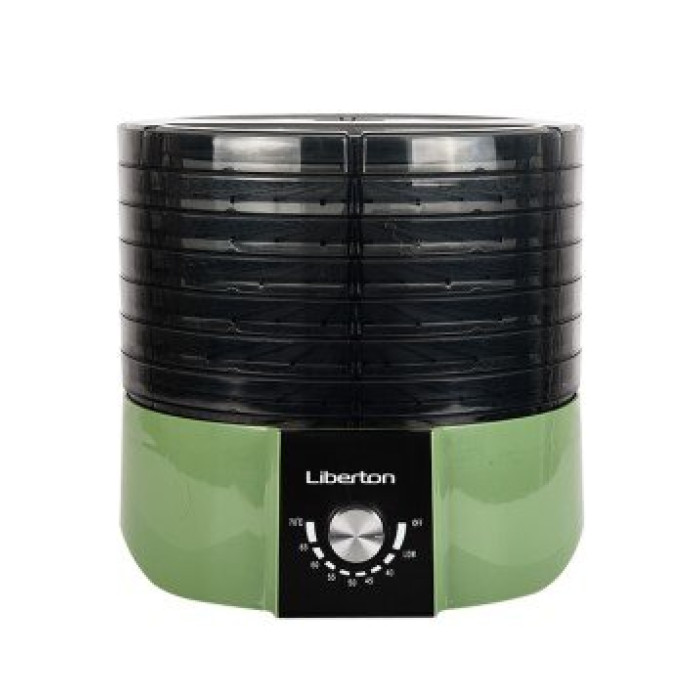 520-ваттный нагреватель и вентилятор модели находятся у основания корпуса, здесь же располагается и единственный орган управления – поворотный переключатель. Он служит как для включения/выключения, так и для выбора необходимой температуры нагрева. Есть режим LOW (около 35 °C) и еще 7 уровней с шагом в 5 градусов Цельсия от 40 до 70 °C. над основанием сушилки фруктов Liberton LFD 5524 располагаются 7 лотков, выполненных из пищевого пластика.