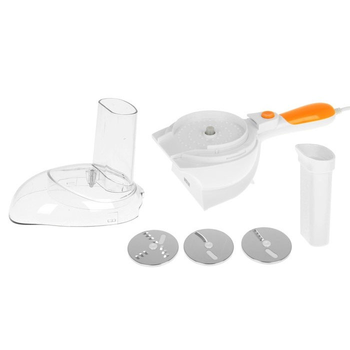 Пристрій має кілька насадок: звичайну та фігурну насадки – шатківниці, а також насадку – терку. Кришка пристрою має завантажувальну горловину. Для абсолютної безпеки тут ви знайдете штовхач, за допомогою якого завантажуються продукти. Цей подрібнювач легко мити після використання. З його зберіганням також не виникне проблем, адже він досить компактний. Ви зможете розмістити пристрій безпосередньо на кухонному столі або в шафі на полиці. Модель працює із потужністю 150 Вт. Час безперервної роботи приладу складає 5 хвилин.