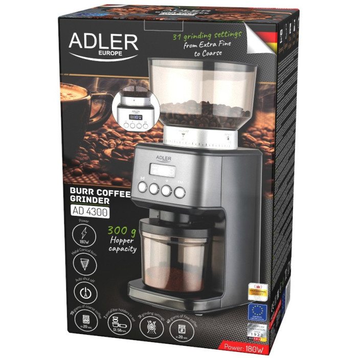 Достаточно эффективная жерновая кофемолка образца 2024 года выпуска, ориентированная на пользователей, которым важны точность, удобство и стабильное качество помола при повседневном приготовлении кофе. Устройство оснащено металлическими жерновами и двигателем мощностью 180 Вт, что обеспечивает равномерное измельчение зерен без перегрева. Система регулировки степени помола предлагает 31 позицию, позволяя адаптировать дисперсность под различные способы заваривания — от френч-пресса до эспрессо.