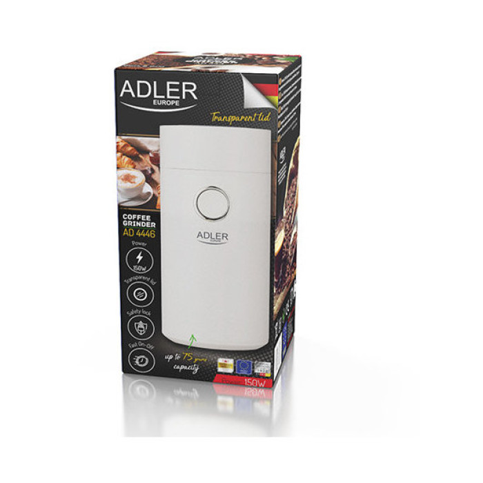 Кофемолка AD 4446 необходимо кухонным оборудованием для людей, которые ценят уникальный вкус кофе и не представляют без нее утренней, дневной перерыва на работе или вечерней встречи с друзьями. Измельчитель имеет емкость 75 г, поэтому позволяет измельчить идеальное количество кофе, чтобы она не потеряла своего аромата, он оснащен крышкой сохраняет аромат, благодаря чему молотый кофе можно использовать для нескольких человек. Максимальная мощность 150 Вт означает, что кофе будет быстро измельченная без необходимости долгого измельчения зерен.