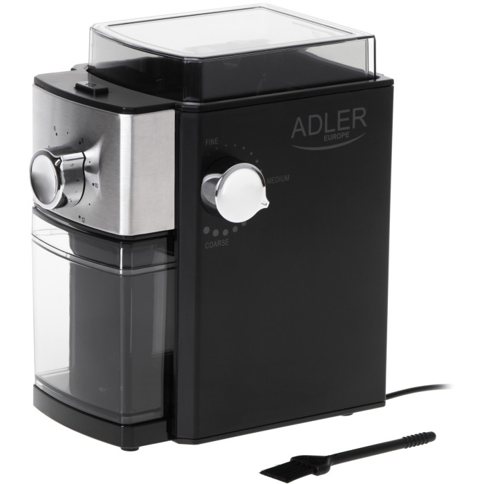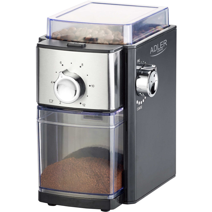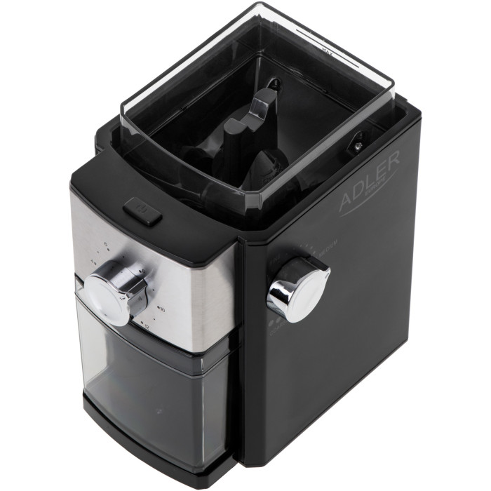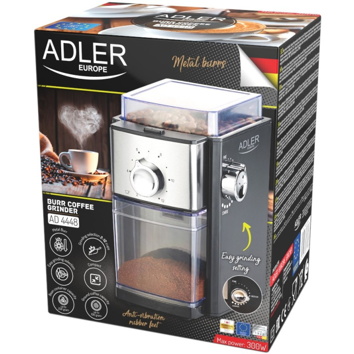 Одной из ключевых особенностей модели является встроенный дозатор, который позволяет отмерять от 2 до 12 порций молотого кофе, что особенно удобно при приготовлении напитков для семьи или гостей. Вместительный отсек для зерен рассчитан на 250 г, а емкость для молотого кофе составляет 100 г, что исключает необходимость частого пополнения запасов. Корпус изготовлен из пластика, что делает кофемолку легкой — ее вес составляет всего 1,4 кг, что упрощает перемещение и хранение. При мощности 300 Вт устройство эффективно справляется с помолом, обеспечивая стабильные результаты. Adler AD 4448 сочетает в себе удобство использования, широкие возможности регулировки и достаточную вместимость, что делает ее потенциально хорошим выбором для дома или небольшого офиса.