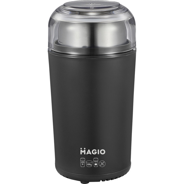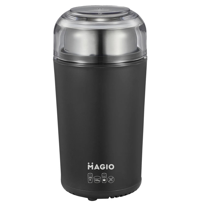 Кофемолка, мощность 200 Вт, емкость 100 гр, четырехлопастной нож из нерж. стали, прозрачная крышка, отсек для шнура, съемная чаша с герметичной крышкой, система безопасности включения/ выключения, корпус из пластика.