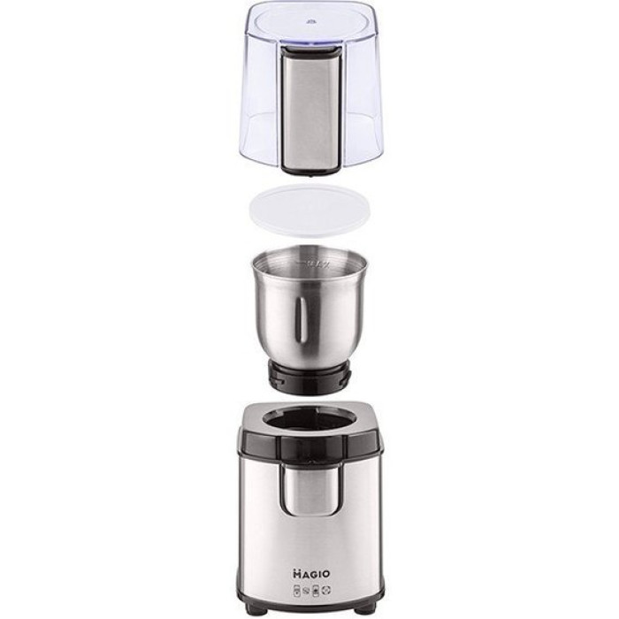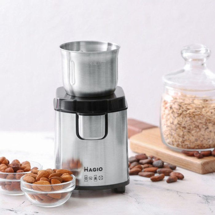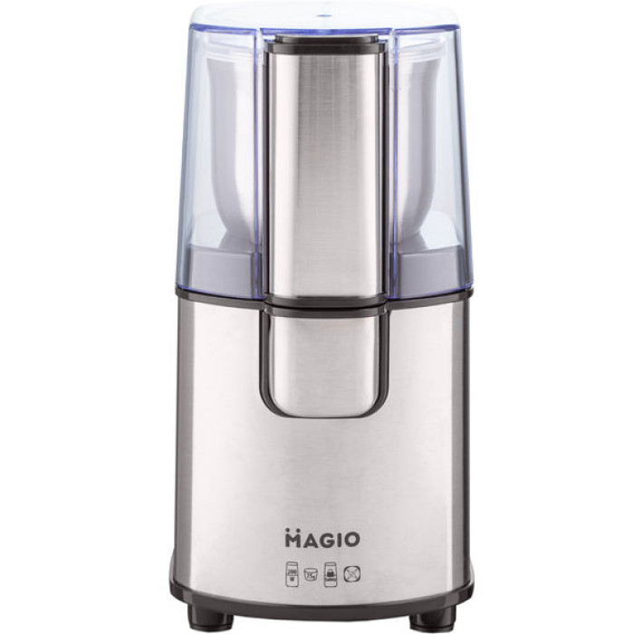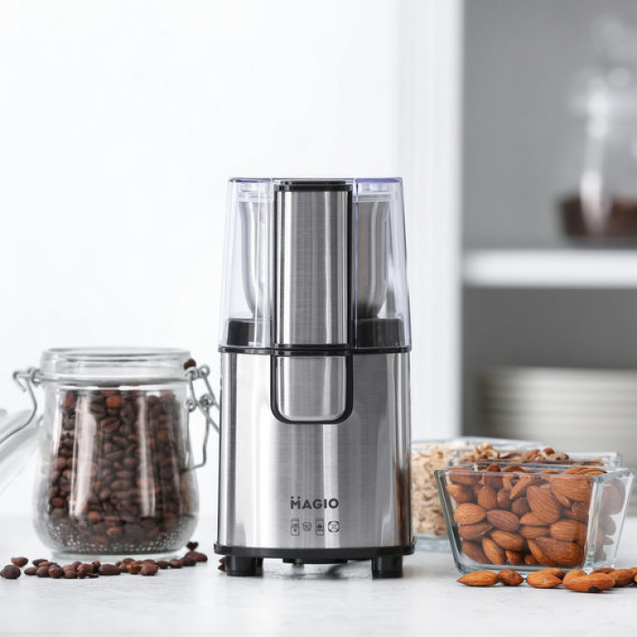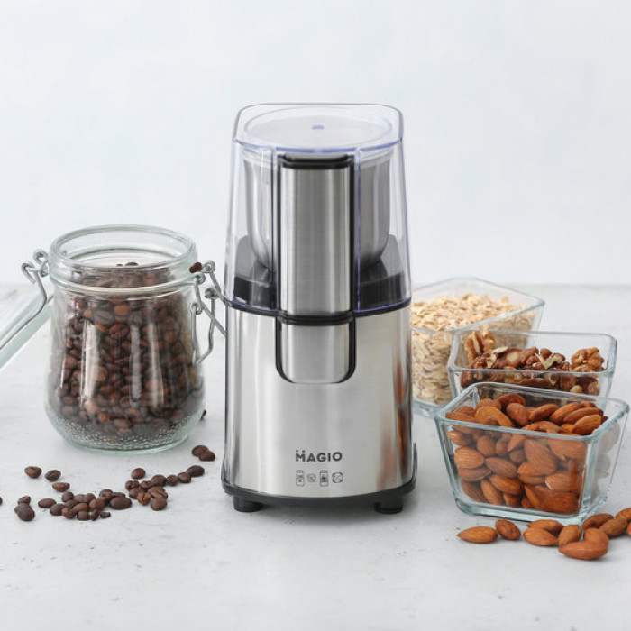 Роторная, компактная кофемолка MG-208 мощностью 200 Вт от компании MAGIO оснащается отсеком для кофейных зерен емкостью 75 грамм.