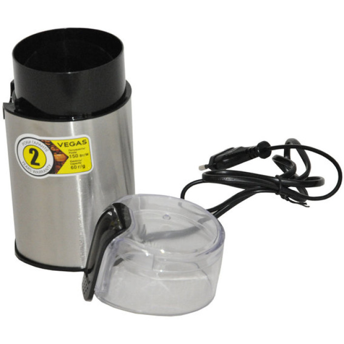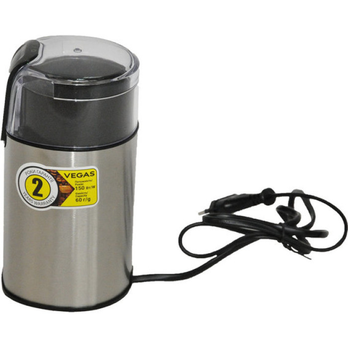 Роторна компактна кавомолка VCG-0008S потужністю 150 Вт від компанії VEGAS оснащується відсіком для кавових зерен ємністю 60 грам.