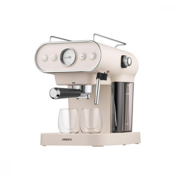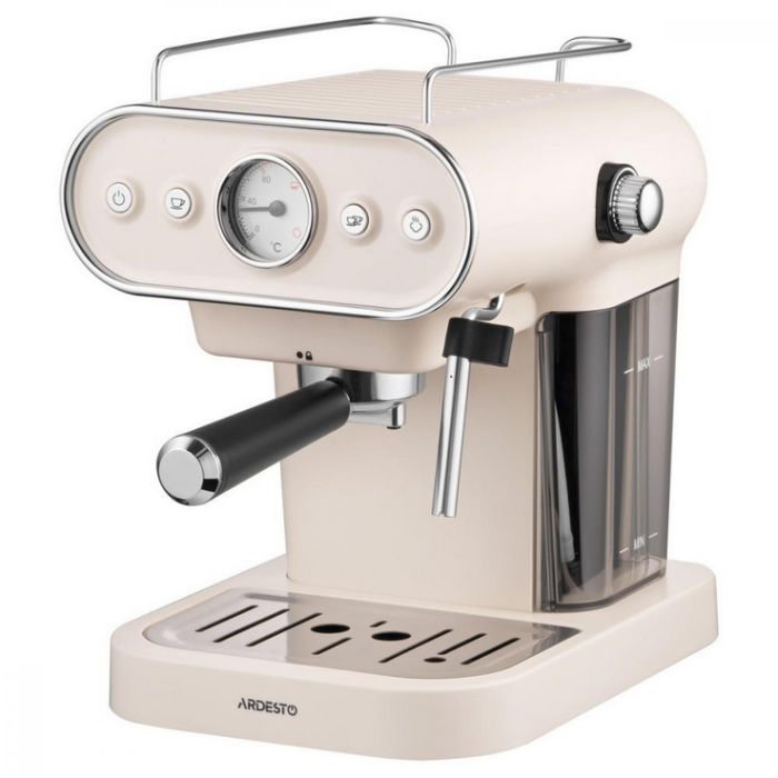 Об'єм резервуару для води Ardesto FCM-E15BG становить 1,2 л, що дозволяє приготувати 12 чашок міцної кави без необхідності доливати воду в процесі приготування. Кавоварка оснащена поверхнею для підігріву чашок, адже для повного розкриття смаку кавових напоїв їх рекомендують наливати в попередньо підігрітий посуд. За допомогою механічного капучинатора з насадкою панарелло з нержавіючої сталі кожен зможе приготувати чудовий капучіно або латте. Все це можливо завдяки подвійному фільтру та насосу з тиском 15 бар. Контролювати температуру нагрівання води буде зручно за допомогою спеціального індикатора у вінтажному стилі. Знімні деталі легко очищаються. У пристрої передбачена система захисту від перегріву та надлишкового тиску.
