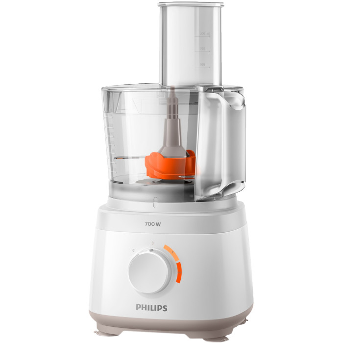 Кухонний комбайн Philips HR7310/00 - стаціонарна багатофункціональна модель, виготовлена в елегантному лаконічному дизайні в корпусі з білого ABS-пластику. Застосований мотор має потужність 700 Вт і працює на двох швидкостях та в імпульсному режимі. Для обробки продуктів використовуються блок з ножами з нержавіючої сталі S-подібної форми, дві насадки: для збивання та замішування тіста, а також двосторонній диск, щоб натирати та шаткувати. Слід зазначити широкий отвір для подачі інгредієнтів, завдяки якому потрібна мінімальна попередня нарізка. Подрібнені, змішані та збиті продукти можуть зберігатись безпосередньо у пластиковій чаші, об'єм якої становить 2,1 літра. Кухонний комбайн Philips HR7310/00 безпечний та зручний в експлуатації. Він встановлений на ковзані ніжки, а всі його аксесуари можна мити в посудомийній машині і зберігати всередині чаші.