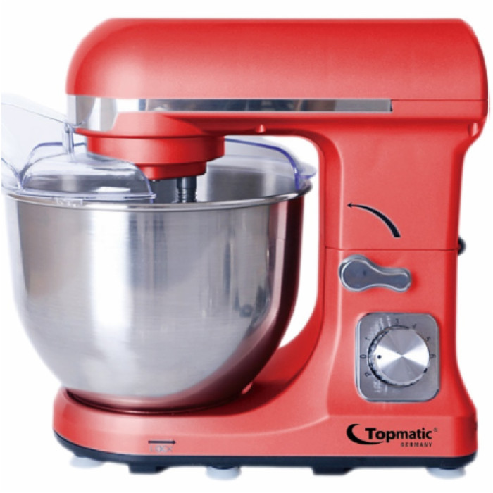 Червона тістомісильна машина, виготовлена з нержавіючої сталі та пластику, має потужність близько 1400 Вт. Тістомісильна машина оснащена дежою з нержавіючої сталі об'ємом 5 літрів, віночком, гачком для тесту, віночком та віночком. До діжі також можна прикріпити прозорий бризковик. Тістомісильна машина має шість регульованих рівнів швидкості. Щоб гарантувати безпечну стійку, тістомісильна машина має нековзні ніжки. Знімні алюмінієві ножі полегшують очищення.
