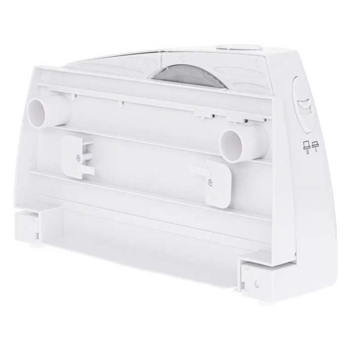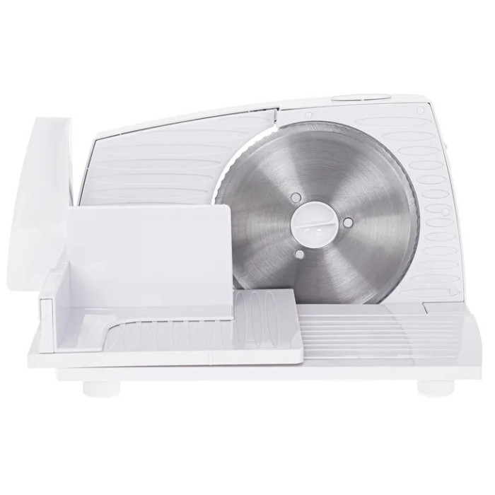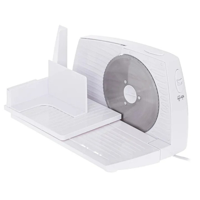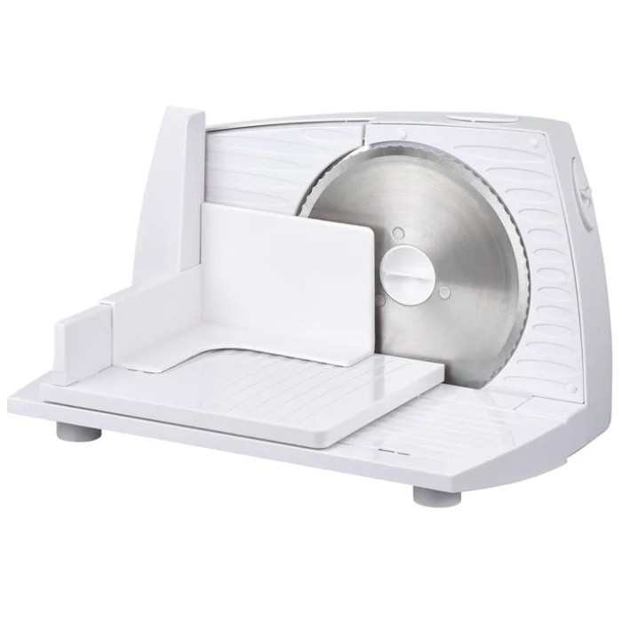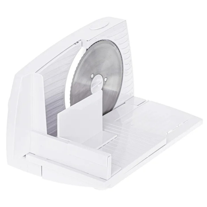 Кнопка безопасности защищает от случайного включения. Пластиковая скользящая пластина также предназначена для защиты пальцев от порезов. Резиновые ножки предотвращают перемещение слайсера.