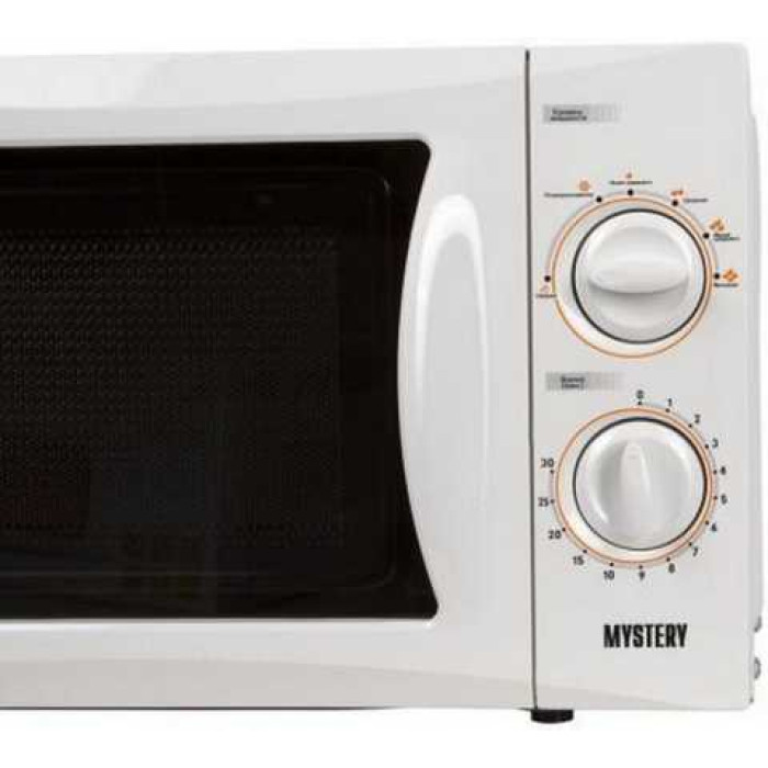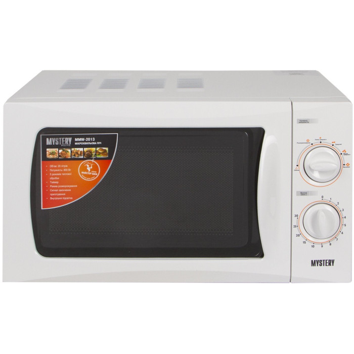 Если вам нужна простая в эксплуатации и одновременно надежная в работе микроволновка, обратите внимание на такую модель, как Mystery MMW-2013. Работать с ней легко, ведь она поможет сэкономить время на размораживании, приготовлении и разогреве пищи. Объем камеры Mystery MMW-2013 составляет 20 л, а диаметр поворотного стола достигает 245 мм, при этом общие размеры соответствуют 45,2х26,2х35,2 см. В данной модели установлено простое и понятное механическое управление, позволяющее выбрать одну из пяти. мощных ступеней, максимум которой будет при значении 800 Вт, и установить таймер.