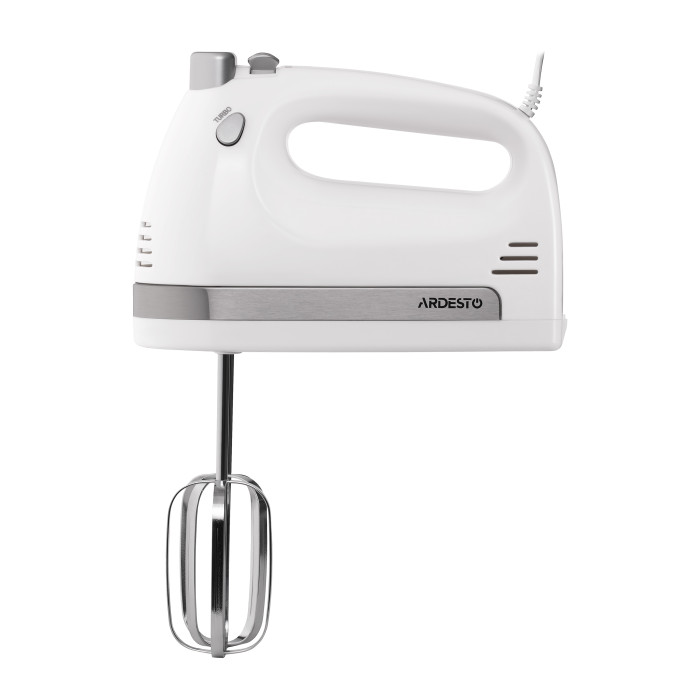 Ручний міксер ARDESTO HMC-3000W з двигуном з мідною обмоткою в корпусі білого кольору. Потужність пристрою становить 300 Вт. Міксер має компактний розмір, завдяки чому поміститься в кухонній шухляді або шафі. Передбачено зручну рукоятку для керування та маневрування під час приготування. Наявність 5 швидкостей дає змогу вибрати найбільш оптимальну. Кнопка турбо робить користування більш ефективним. У комплекті є найнеобхідніше: вінчик для збивання × 2 шт.; гачки для тіста × 2 шт. Система безпеки передбачає захист від перегріву. Довжина шнура становить 1,2 м.
